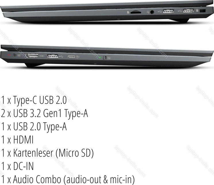 - 1x USB-C 2.0 (480Mb/s), 2x USB-A 3.0 (5Gb/s), 1x USB-A 2.0 (480Mb/s), 1x HDMI, 1x 3.5 mm audio jack, 1x microSD, 1x DC-In Power connector (Power port)