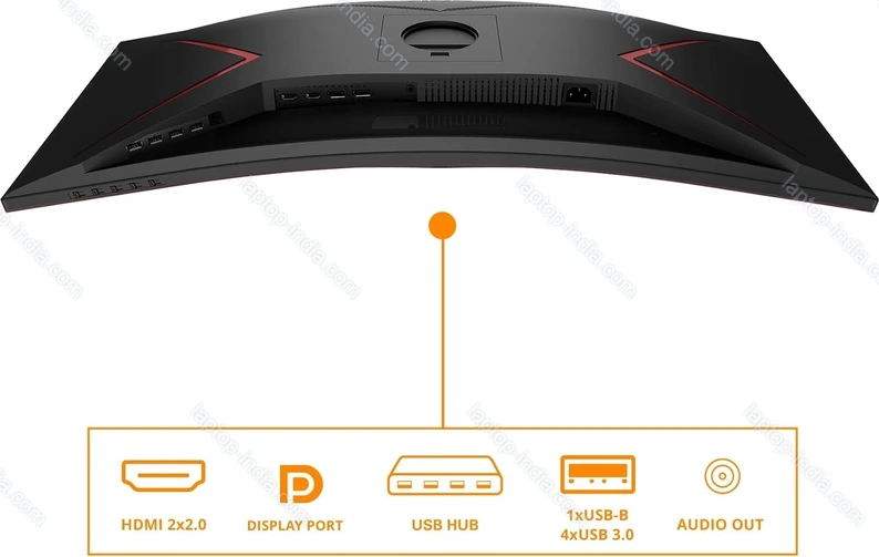 - 2x DisplayPort 1.4 (HDCP 2.2, 180Hz@3440x1440), 2x HDMI (HDCP 2.2, 100Hz@3440x1440), 1x USB-B 3.0 (Upstream, 5Gb/s), 4x USB-A 3.0 (downstream, 5Gb/s), 1x 3.5mm jack Line-Out, 1x AC-In C14