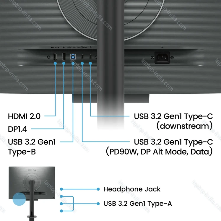 - 1x DisplayPort 1.4 (60Hz@3840x2560), 1x HDMI 2.0 (50Hz@3840x2560), 1x USB-C 3.0 with DisplayPort 1.4 (Upstream, 5Gb/s, PD-Out 90W, 60Hz@3840x2560), 1x USB-B 3.0 (Upstream, 5Gb/s), 3x USB-A 3.0 (downstream, 5Gb/s, BC 4.5W), 1x 3.5mm jack Line-Out, 1x USB-C 3.0 with DisplayPort-Out (downstream, 5Gb/s, BC 7.5W), 1x AC-In C14