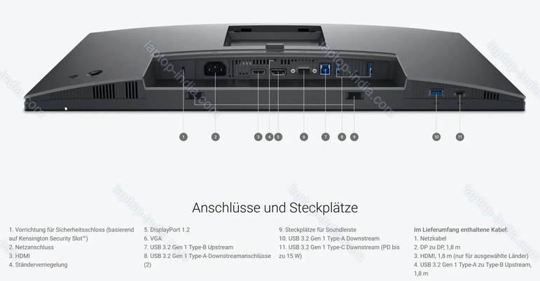 - 1x DisplayPort 1.2 (HDCP 1.4, 100Hz@1920x1080), 1x HDMI 1.4 (HDCP 1.4, 100Hz@1920x1080), 1x VGA (60Hz@1920x1080), 1x USB-C 3.0 (downstream, 5Gb/s, PD-Out 15W), 1x USB-B 3.0 (Upstream, 5Gb/s), 3x USB-A 3.0 (downstream, 5Gb/s), 1x AC-In C14