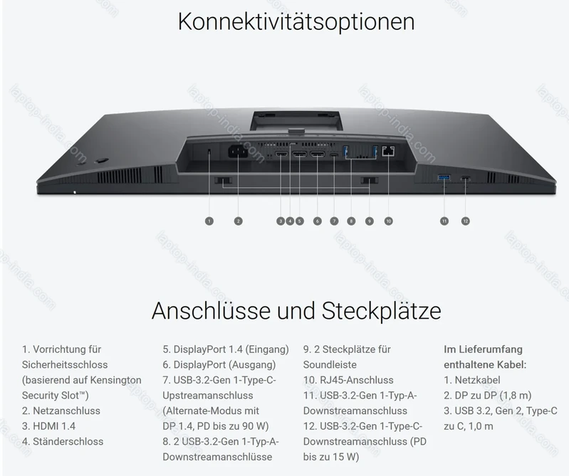 - 1x DisplayPort 1.4 (HDCP 1.4, 100Hz@1920x1080), 1x HDMI 1.4 (HDCP 1.4, 100Hz@1920x1080), 1x USB-C 3.1 with DisplayPort 1.4 (Upstream, 10Gb/s, PD-Out 90W, 100Hz@1920x1080), 1x USB-C 3.0 (downstream, 5Gb/s, PD-Out 15W), 3x USB-A 3.0 (downstream, 5Gb/s), 1x RJ-45 (1000Base-T), 1x DisplayPort-Out 1.4, 1x AC-In C14