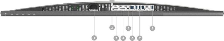 - 2x DisplayPort 1.4 (60Hz@7680x4320, common usage needed), 1x USB-B 3.0 (Upstream, 5Gb/s), 4x USB-A 3.0 (downstream, 5Gb/s), 1x 3.5mm jack Line-Out, 1x AC-In C14