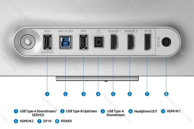 - 1x DisplayPort 1.4 (HDCP 2.2), 2x HDMI 2.1 (HDCP 2.2), 1x USB-B 3.0 (Upstream, 5Gb/s), 2x USB-A 3.0 (downstream, 5Gb/s), 1x DC In hollow socket